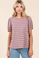 The Striped Short Puff Sleeve Knit Top is a charming and feminine piece that adds a touch of whimsy to any outfit. Featuring classic stripes, this top exudes a timeless and versatile appeal. The short puff sleeves add a playful and romantic flair, perfect for adding a stylish detail to your look. Crafted from knit fabric, this top offers a comfortable and flattering fit. Pair it with high-waisted jeans or a skirt for a chic and casual ensemble that is perfect for various occasions. Embrace a playful yet elegant style with the Striped Short Puff Sleeve Knit Top as a delightful addition to your wardrobe.