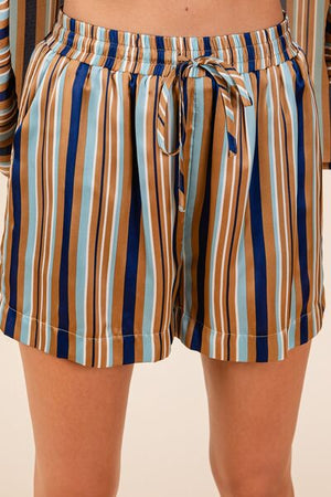The Drawstring Striped Satin Shorts are a trendy and comfortable option for warm weather. The satin fabric adds a touch of elegance and sheen to the design. Featuring a drawstring waist, these shorts offer a customizable and secure fit. The striped pattern adds a fun and playful element to the style. Pair them with a simple tank top and sandals for a chic and laid-back summer look.