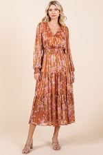 Mittoshop Flower Print Satin Lurex Stripe Smocked Midi Dress