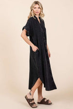 Mittoshop Mineral Wash V Neck Button Up Midi Shirt Dress